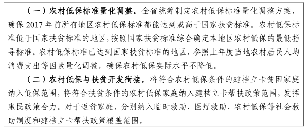 精準(zhǔn)認(rèn)定和幫扶低保對(duì)象。健全低保對(duì)象認(rèn)定辦法,完善社會(huì)救助家庭經(jīng)濟(jì)狀況核對(duì)機(jī)制,規(guī)范農(nóng)村低保審核審批程序,精準(zhǔn)認(rèn)定低保對(duì)象。加強(qiáng)農(nóng)村低保與脫貧攻堅(jiān)相關(guān)政策的有效銜接,采取就業(yè)成本扣減等措施,引導(dǎo)有勞動(dòng)能力的低保對(duì)象依靠自身努力脫貧致富。