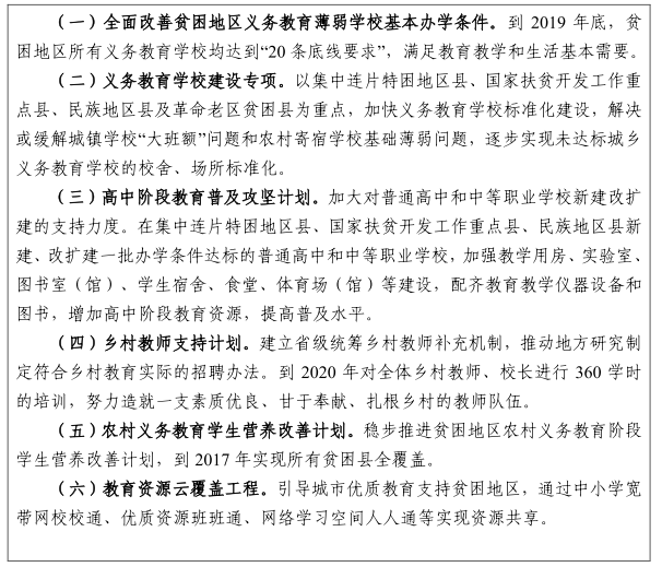改善辦學(xué)條件。實(shí)施基礎(chǔ)教育鞏固提升計(jì)劃,合理布局貧困地區(qū)農(nóng)村中小學(xué)校,全面改善貧困地區(qū)義務(wù)教育薄弱學(xué)?;巨k學(xué)條件,加強(qiáng)農(nóng)村寄宿制學(xué)校建設(shè),辦好確需保留的村小學(xué)和教學(xué)點(diǎn),建立城鄉(xiāng)統(tǒng)一、重在農(nóng)村的義務(wù)教育經(jīng)費(fèi)保障機(jī)制。到2018年,完成"全面改薄",2020年徹底改善7000多所非完全小學(xué)和教學(xué)點(diǎn)的基本辦學(xué)條件。切實(shí)推進(jìn)農(nóng)村公辦幼兒園建設(shè),不斷擴(kuò)大學(xué)前教育覆蓋面。引導(dǎo)和鼓勵(lì)在人口較為集中的貧困村建設(shè)普惠性幼兒園,其他貧困村通過鄉(xiāng)鎮(zhèn)中心幼兒園辦分園、小學(xué)附設(shè)學(xué)前班,建立巡回支教點(diǎn)、社會(huì)力量辦園等方式發(fā)展學(xué)前教育,優(yōu)先保障貧困家庭適齡兒童接受學(xué)前教育。