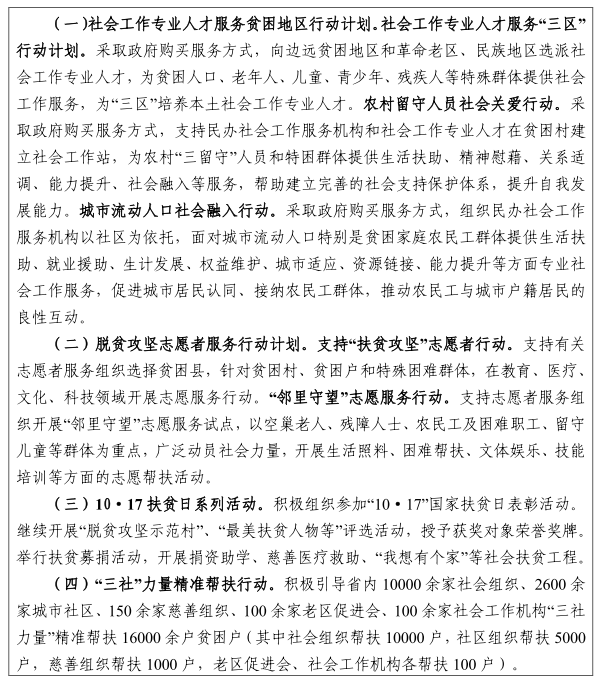 推進(jìn)專業(yè)社會(huì)工作扶貧。實(shí)施社會(huì)工作專業(yè)人才服務(wù)貧困地區(qū)行動(dòng)計(jì)劃。采取政府購(gòu)買服務(wù)方式,組織民辦社會(huì)工作服務(wù)機(jī)構(gòu),以農(nóng)村留守人員、城市流動(dòng)人口為重點(diǎn),開展專業(yè)社會(huì)服務(wù)。鼓勵(lì)發(fā)達(dá)地區(qū)社會(huì)工作專業(yè)人才到邊遠(yuǎn)貧困地區(qū)、革命老區(qū)、民族地區(qū)為貧困人口提供社會(huì)工作服務(wù),為當(dāng)?shù)嘏嘤鐣?huì)工作服務(wù)機(jī)構(gòu),培養(yǎng)社會(huì)工作專業(yè)人才。推動(dòng)社會(huì)工作專業(yè)人才參與扶貧工作,加強(qiáng)對(duì)社會(huì)扶貧工作人員和扶貧志愿者的社會(huì)工作知識(shí)培訓(xùn),提高扶貧服務(wù)質(zhì)量。