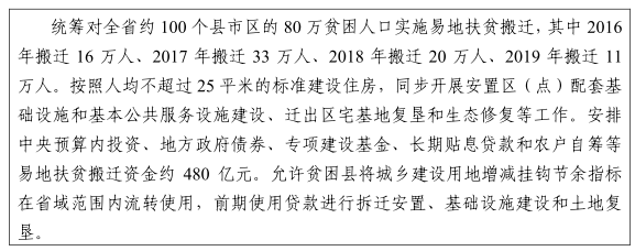 組織實(shí)施好易地扶貧搬遷工程,確保搬遷群眾住房安全得到有效保障,安全飲水、出行、用電、通訊等生活需要得到基本滿足,享有便利可及的教育、醫(yī)療等基本公共服務(wù),遷出區(qū)生態(tài)環(huán)境明顯改善,安置區(qū)特色產(chǎn)業(yè)加快發(fā)展,收入水平不斷提高。到2020年,實(shí)現(xiàn)約80萬貧困人口搬得出、穩(wěn)得住、能脫貧。