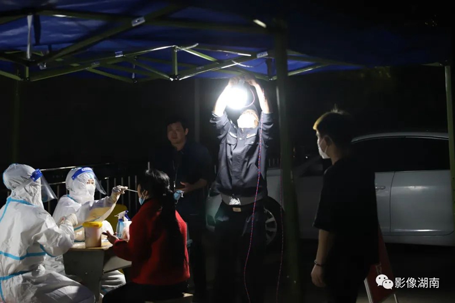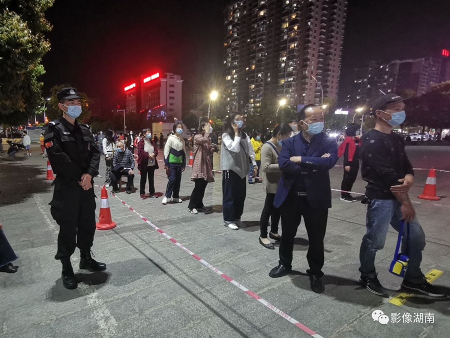 3月21日晚,永州市冷水灘區(qū)城市綠島小區(qū),管控區(qū)居民正在有序進行第二輪核酸檢測。雷中祥 蔣凌志 攝