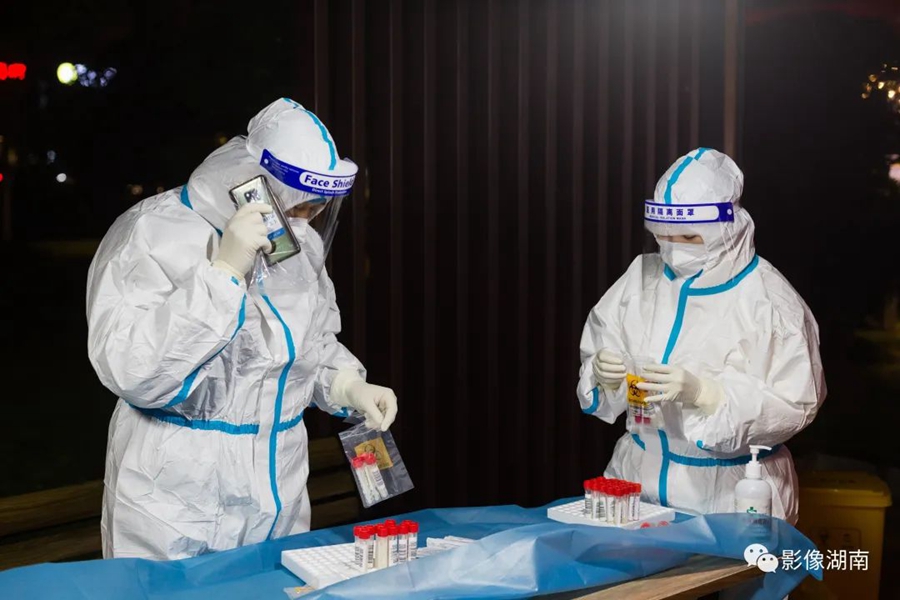 3月21日晚,瀏陽市才常廣場,醫(yī)護人員裝好試管,準備回家。賀再亮 攝