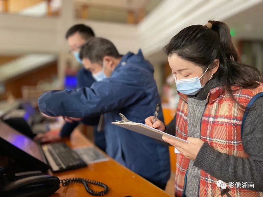 3月20日,藍山縣塔峰鎮(zhèn)二廣高速公路出口,工作人員在查驗進入縣城人員的健康碼和行程卡信息。楊雄春 攝