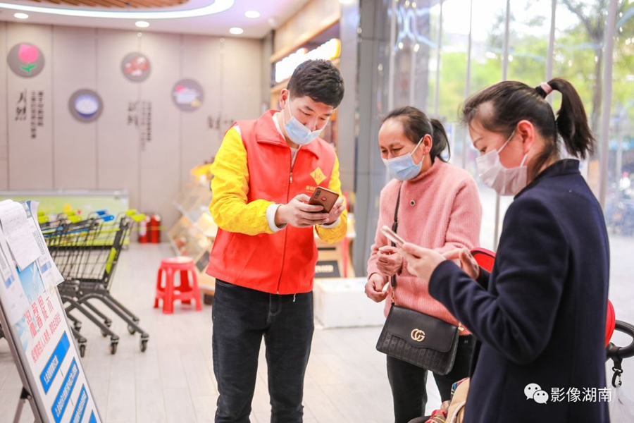 3月21日,藍山縣塔峰鎮(zhèn)城東路一超市入口,工作人員引導顧客掃“場所碼”。彭華 攝