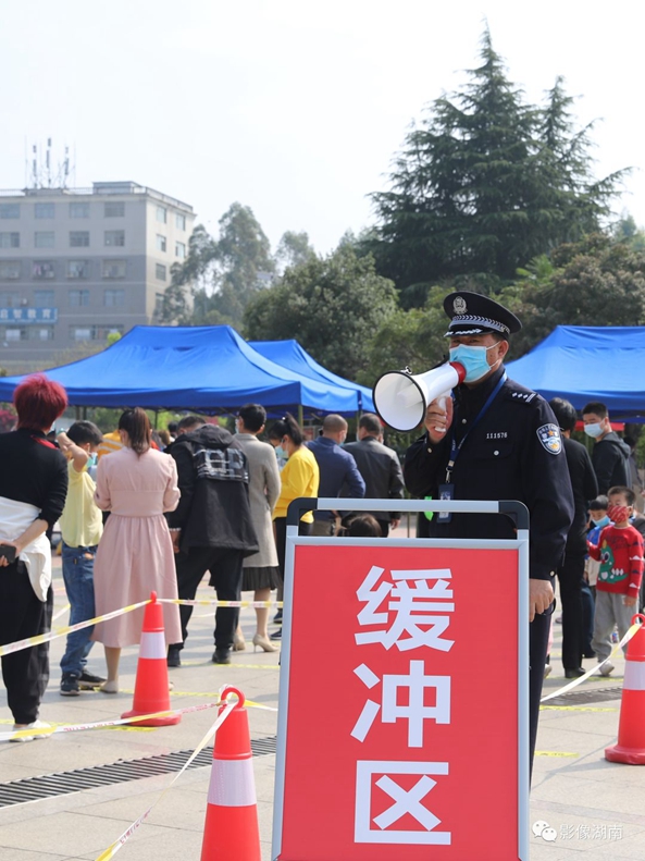 永州市公安局冷水灘分局,執(zhí)勤民警引導群眾排隊。陳偉 攝