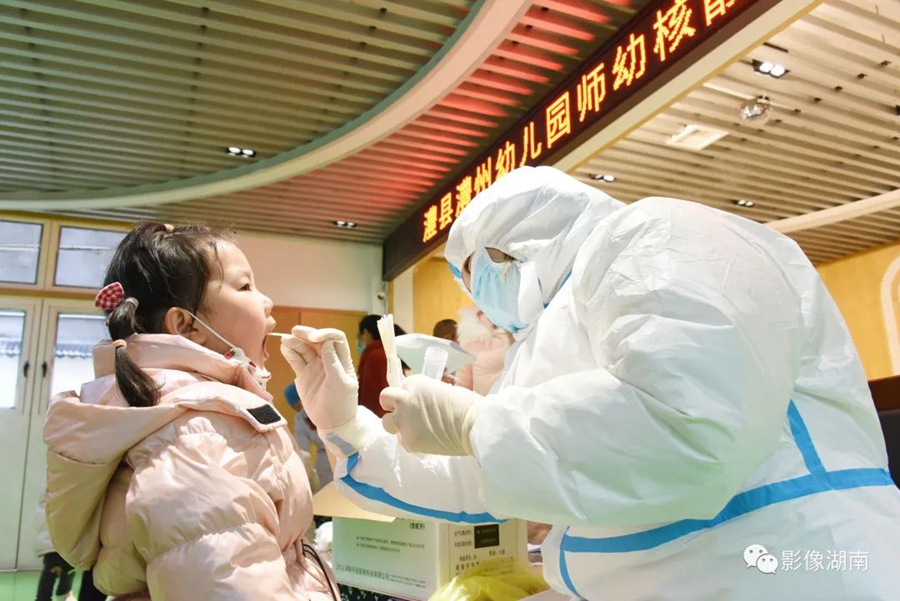 3月22日,澧縣澧州幼兒園,醫(yī)務人員為學生采集核酸檢測樣本。柏依樸 曹俊 攝