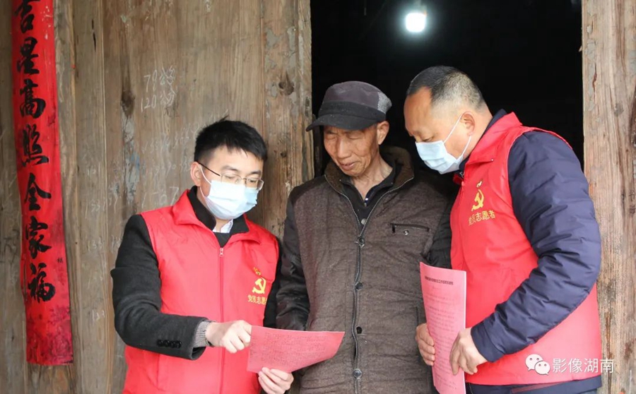 3月20日,永順縣毛壩鄉(xiāng)團結村,黨員志愿者上門宣傳疫情防控知識。吳煉 肖大全 攝