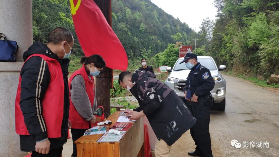 江華瑤族自治縣湘江鄉(xiāng)青年志愿者在桐沖口村設置防控卡點登記進出鄉(xiāng)人員。通訊員 攝
