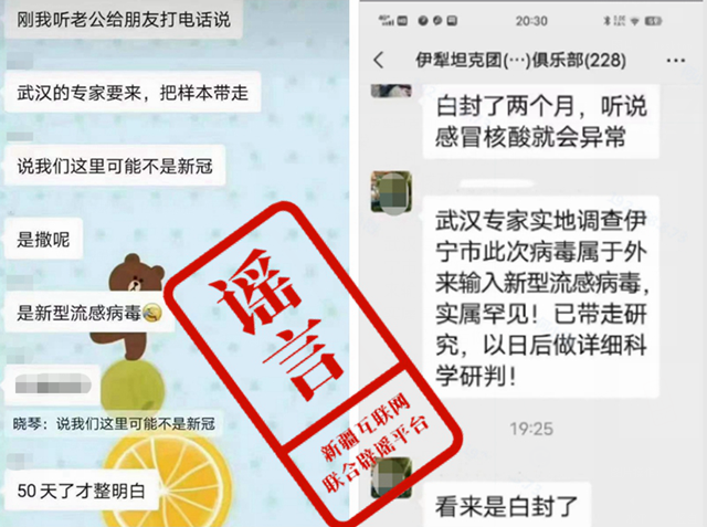 有網民在微信群組、微博、今日頭條等平臺以短視頻、圖片、文字等形式散布“從今天開始,新疆本地核酸檢測機構不參與檢測,全部由內地的檢測機構檢測......”“河北、天津、成都、武漢、江蘇、中科院等防疫專家抵達烏魯木齊,已經開了誓師大會,明確制定負責各自區(qū)域的防疫目標......”等虛假信息及類似變種樣本,經與有關部門核實查證,上述信息均為網絡謠言。