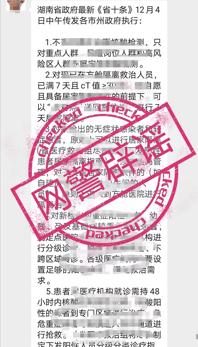經(jīng)向相關(guān)部門核實(shí),今日網(wǎng)上流傳的“湖南省政府最新《省十條》12月4日中午傳發(fā)各市州政府執(zhí)行”的消息是不實(shí)信息,省政府近日截止目前并未發(fā)布如附圖所示的所謂的“省十條”。網(wǎng)警提示齊心協(xié)力共同抗疫,不造謠、不傳謠、不信謠,共同維護(hù)清朗網(wǎng)絡(luò)秩序。