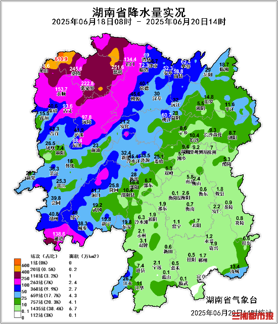 6月20日,記者從湖南省氣象臺(tái)獲悉,18日以來(截至20日14時(shí)),強(qiáng)降雨主要位于湘西北、湘西南,全省平均面雨量41.5毫米,其中張家界市282.6毫米、湘西土家族苗族自治州99.6毫米、常德市96.7毫米。張家界、湘西土家族苗族自治州、常德、懷化4市(州)11縣(市、區(qū))121鄉(xiāng)(鎮(zhèn))超過200毫米,張家界、湘西土家族苗族自治州(龍山)、常德(石門)6縣(市、區(qū))13鄉(xiāng)(鎮(zhèn))超過400毫米,桑植、龍山2縣4鄉(xiāng)(鎮(zhèn))超過500毫米,最大為桑植八大公山鎮(zhèn)610.9毫米,小時(shí)雨強(qiáng)最大為石門白云鎮(zhèn)102.3毫米。