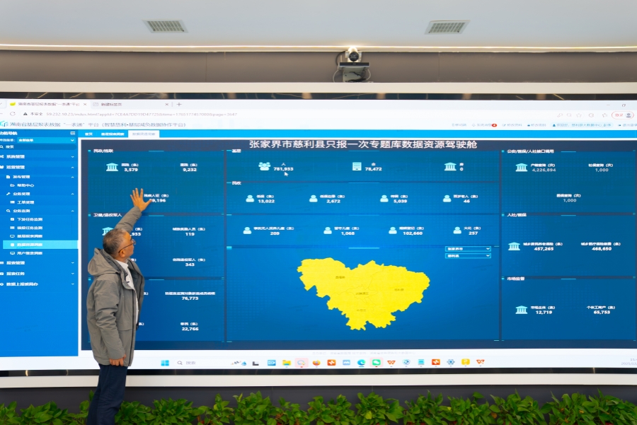 12月8日,慈利縣大數(shù)據(jù)中心,工作人員展示智慧慈利·基層減負數(shù)據(jù)協(xié)作平臺。