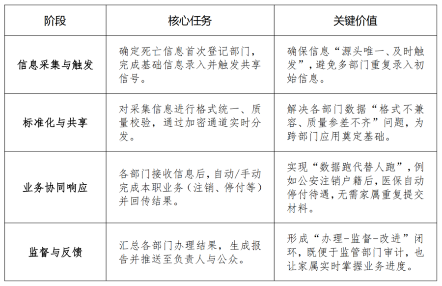 出數(shù)據(jù):建立公安、衛(wèi)健、人社、民政與醫(yī)保部門之間穩(wěn)定、實時的死亡人員信息共享數(shù)據(jù)通道,實現(xiàn)死亡人員信息的及時、準確傳輸與共享。
