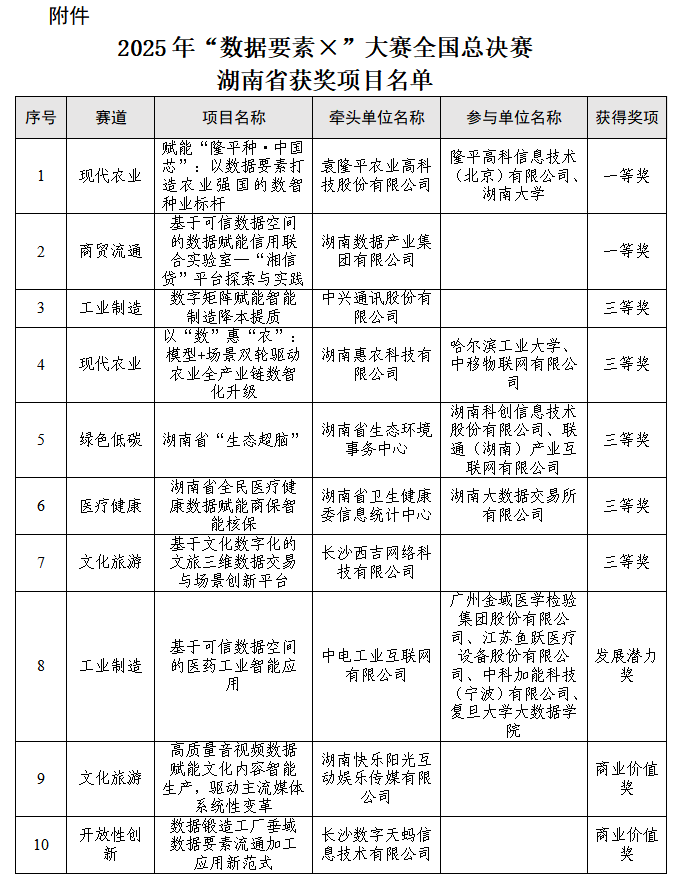 10月29日,國家數(shù)據(jù)局公布了2025年“數(shù)據(jù)要素×”大賽全國總決賽獲獎(jiǎng)項(xiàng)目名單,湖南共有10個(gè)項(xiàng)目獲獎(jiǎng),其中2個(gè)項(xiàng)目獲一等獎(jiǎng)、5個(gè)項(xiàng)目獲三等獎(jiǎng)、1個(gè)項(xiàng)目獲發(fā)展?jié)摿Κ?jiǎng)、2個(gè)項(xiàng)目獲商業(yè)價(jià)值獎(jiǎng),獲一等獎(jiǎng)項(xiàng)目數(shù)居全國第二、中部省份第一。