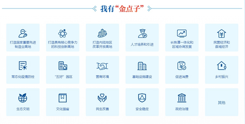 7月至9月期間,一共有8萬人次參與該征集活動,收到有效建議1682條?;顒幼罱K還評選出了十大“金點子”,聚焦當(dāng)前政務(wù)服務(wù)工作急需解決的重點、難點、堵點問題,涉及“互聯(lián)網(wǎng)+政務(wù)服務(wù)”一體化平臺應(yīng)用、政務(wù)服務(wù)大廳日常管理、深化“一件事一次辦”改革等10個方面。