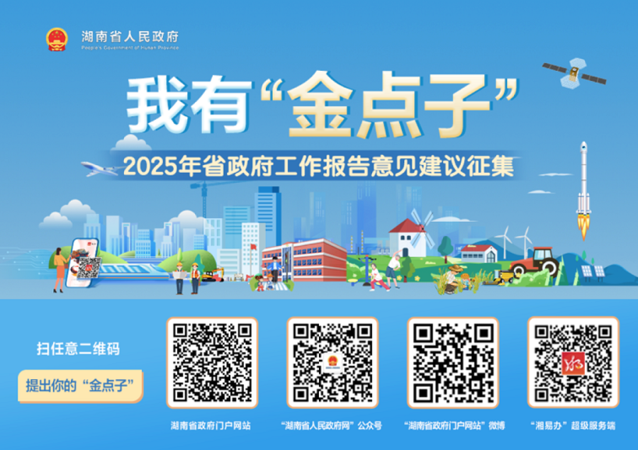 在2025年湖南省“兩會”即將召開之際,為更好聽民意知民愿聚眾智,做好2025年省政府工作報告起草工作,即日起至2025年湖南省兩會召開前,湖南省政府門戶網(wǎng)站聯(lián)合多家媒體與各市州、省直部門政府網(wǎng)站和政務新媒體以及“湘易辦”超級服務端,開展“我有‘金點子’——2025年湖南省政府工作報告意見建議征集”活動。