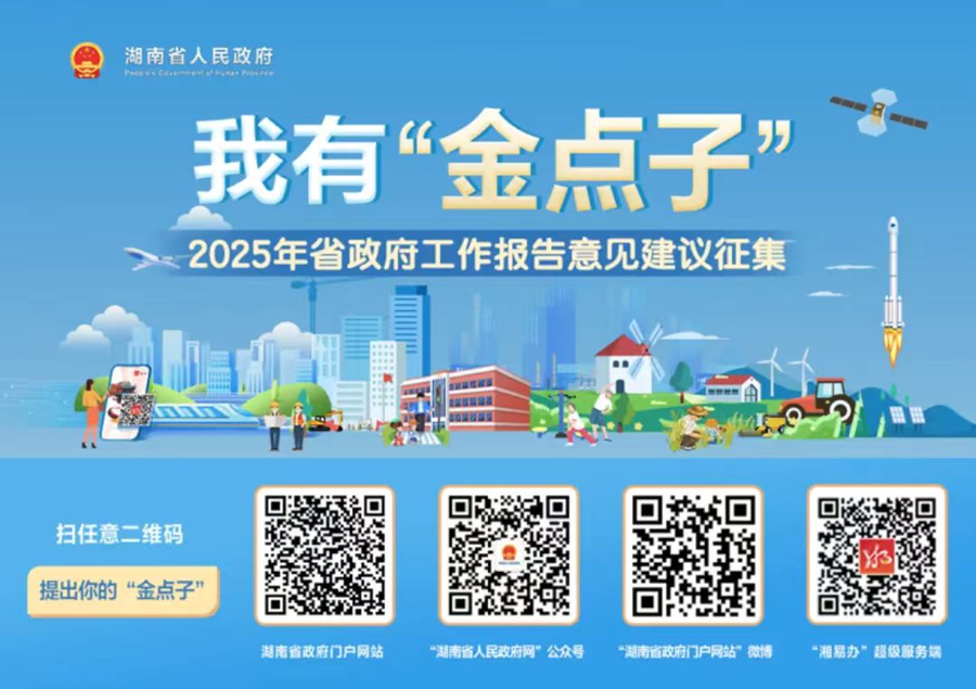 在2025年湖南省“兩會”即將召開之際,為更好聽民意知民愿聚眾智,做好2025年省政府工作報告起草工作,即日起至2025年湖南省兩會召開前,湖南省政府門戶網(wǎng)站聯(lián)合多家媒體與各市州、省直部門政府網(wǎng)站和政務(wù)新媒體以及“湘易辦”超級服務(wù)端,開展“我有‘金點(diǎn)子’——2025年湖南省政府工作報告意見建議征集”活動。院(中心)作為馬克思主義的堅(jiān)強(qiáng)陣地、省委省政府的核心智庫、哲學(xué)社會科學(xué)的重要力量,為我省經(jīng)濟(jì)社會高質(zhì)量發(fā)展提供“金點(diǎn)子”、開出“好方子”,是每一名社科人的責(zé)任和使命。院(中心)特向全體干部職工發(fā)出倡議,請您結(jié)合自身研究和工作領(lǐng)域,積極建言獻(xiàn)策。