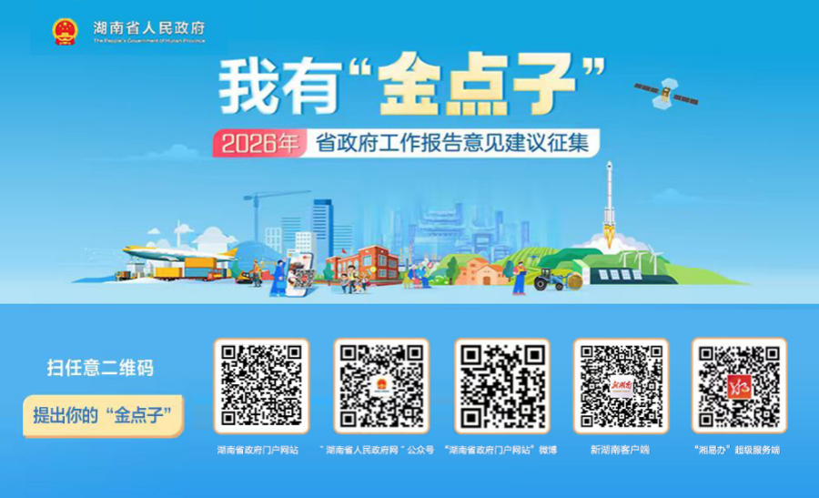 在2026年湖南省兩會(huì)即將召開之際,為更好聽民意知民愿聚眾智,繪就三湘發(fā)展“同心圓”,做好2026年省政府工作報(bào)告起草工作,即日起至2026年省兩會(huì)前,省政府門戶網(wǎng)站聯(lián)合多家媒體與各市州、省直部門政府網(wǎng)站和政務(wù)新媒體以及“湘易辦”超級服務(wù)端,舉辦省政府工作報(bào)告“金點(diǎn)子”征集活動(dòng)。