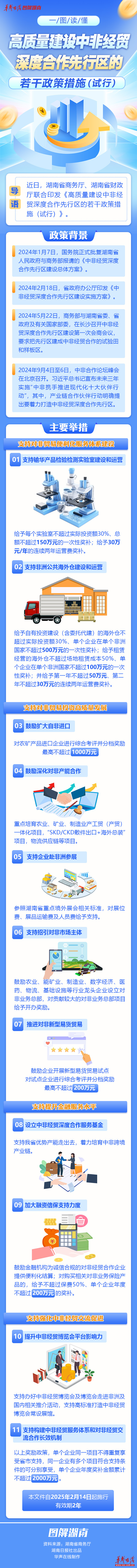 近日,湖南省商務(wù)廳、湖南省財政廳聯(lián)合印發(fā)《高質(zhì)量建設(shè)中非經(jīng)貿(mào)深度合作先行區(qū)的若干政策措施(試行)》?!墩摺方榻B,單個企業(yè)年度獎補金額累計不超過2000萬元?!墩摺愤€有哪些亮點內(nèi)容,一圖帶你讀懂。