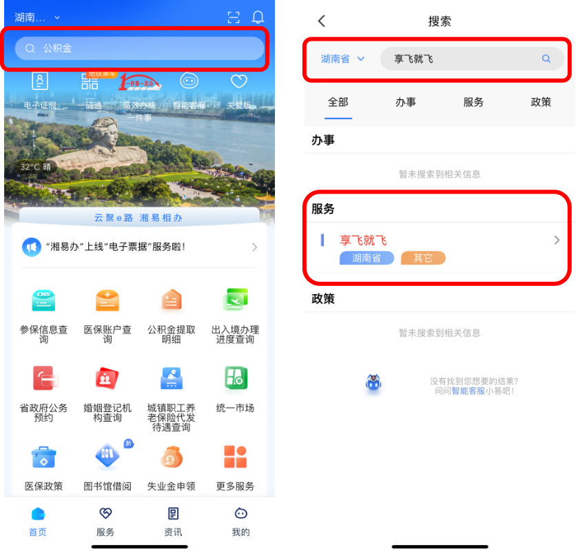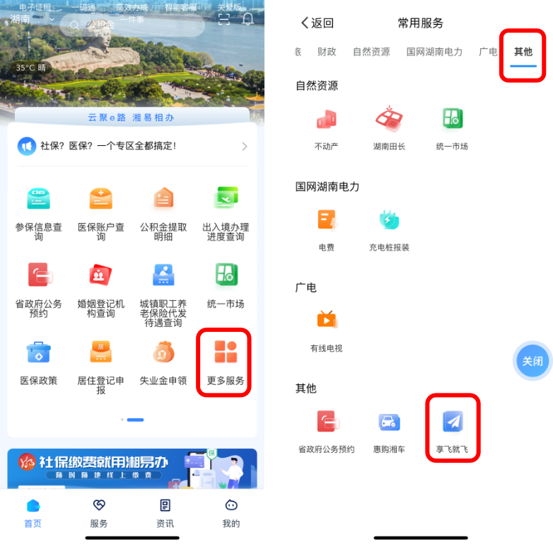 登陸“湘易辦”APP后,在首頁(yè)搜索“享飛就飛”,或在首頁(yè)金剛區(qū)選擇“更多服務(wù)”,選擇“其他”,找到“享飛就飛”,點(diǎn)擊即可進(jìn)入服務(wù)。