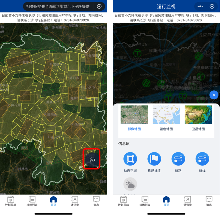 點(diǎn)擊圖示的設(shè)置按鈕,可設(shè)置地圖類型和信息層。選擇地圖是否顯示動(dòng)態(tài)空域、航線、航路、機(jī)場(chǎng)標(biāo)注等信息。