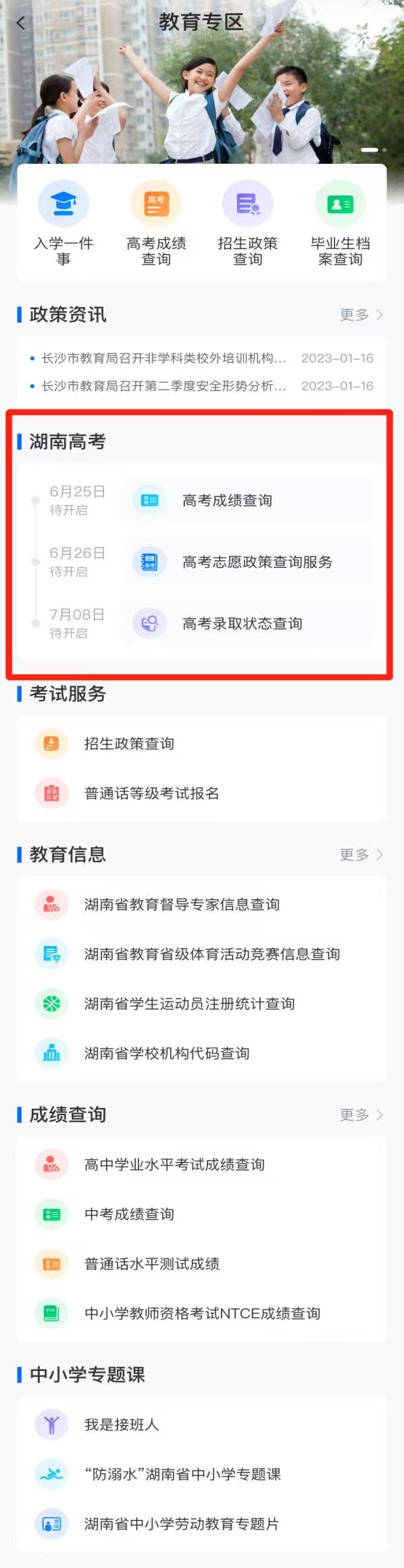 湖南省高考成績和錄取控制分?jǐn)?shù)線于6月25日公布。今年,考生可通過“湘易辦”超級(jí)服務(wù)端“智慧教育”專區(qū)服務(wù)查詢2023年湖南高考成績、高考志愿政策及高考錄取狀態(tài)。
