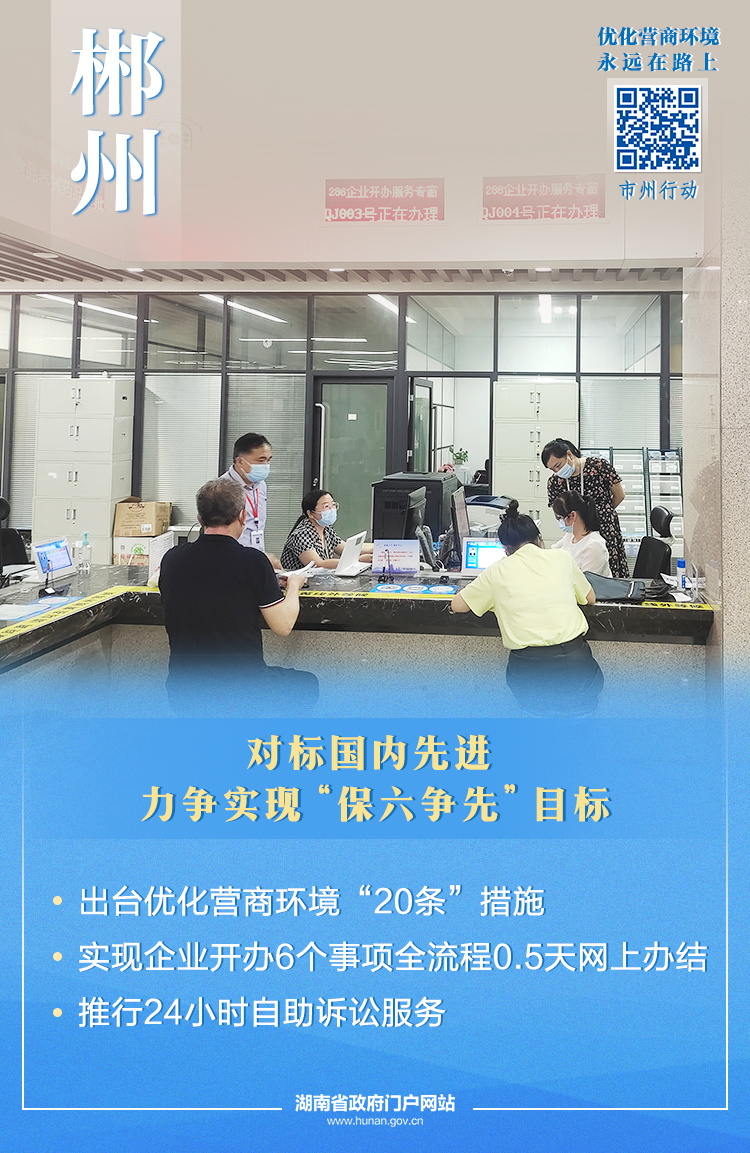 郴州市創(chuàng)新啟動企業(yè)全生命周期“一件事一次辦”改革試點,開辦企業(yè)實現(xiàn)0.5個工作日辦結(jié)。