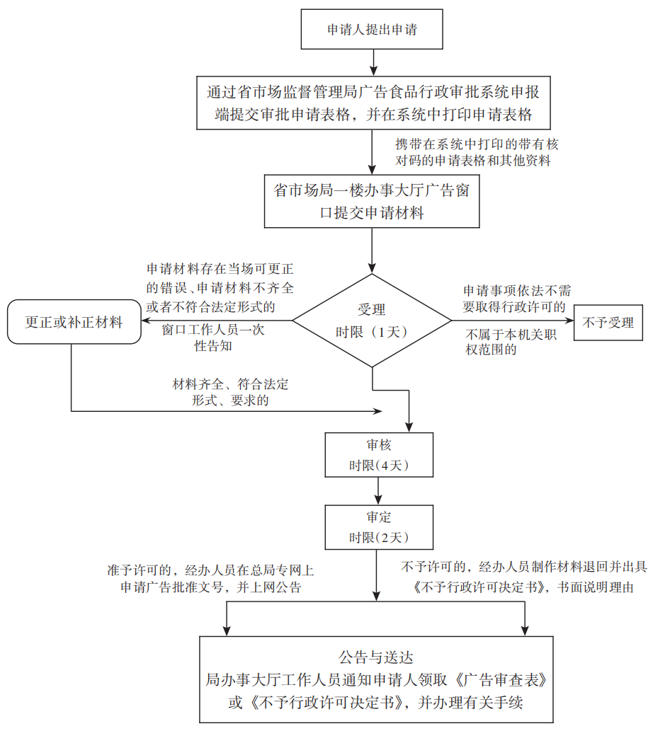 申請(qǐng)人通過(guò)省市場(chǎng)監(jiān)督管理局廣告食品行政審批系統(tǒng)申報(bào)端提交審批申請(qǐng)表格,并在系統(tǒng)中打印申請(qǐng)表格,攜帶在系統(tǒng)中打印的帶有核對(duì)碼的申請(qǐng)表格和其他資料,前往湖南省市場(chǎng)監(jiān)督管理局政務(wù)服務(wù)大廳現(xiàn)場(chǎng)辦理。
