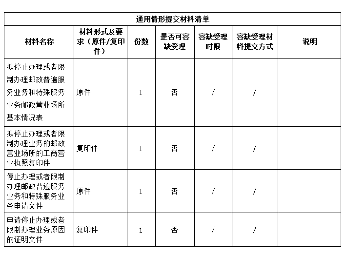 我要申請停止辦理或者限制辦理郵政普遍服務(wù)和郵政特殊服務(wù)業(yè)務(wù)審批(郵政企業(yè))