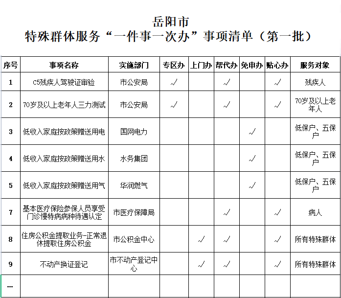 岳陽將特殊群體辦證、補(bǔ)貼等高頻服務(wù)事項(xiàng)匯總,建立特殊群體的政務(wù)服務(wù)事項(xiàng)庫,深度優(yōu)化服務(wù)流程,開通服務(wù)“綠色通道”,區(qū)分不同年齡階段、不同生活習(xí)慣、不同情況的特殊群體,分類梳理出專區(qū)辦、上門辦、幫代辦、免申辦、貼心辦等“五辦”事項(xiàng)清單86項(xiàng),采取有針對性、差異化的解決方案,為特殊群體提供個(gè)性服務(wù)。
