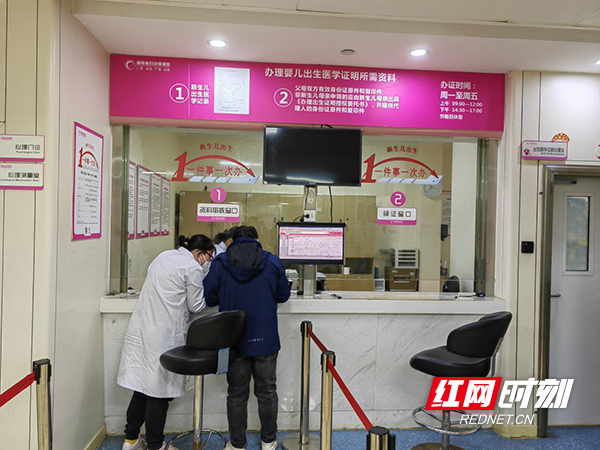 湖南省婦幼保健院的醫(yī)護人員指導(dǎo)新生兒父母進行手續(xù)辦理。