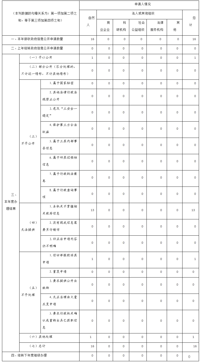 ?。ǘ╆P(guān)于依申請(qǐng)公開情況。規(guī)范依申請(qǐng)公開工作,根據(jù)新修訂的《中華人民共和國(guó)政府信息公開條例》,重新梳理依申請(qǐng)公開事項(xiàng)類型及處理方式,制定依申請(qǐng)辦理流程圖,優(yōu)化受理渠道,明確各環(huán)節(jié)辦理責(zé)任,建立依申請(qǐng)公開事項(xiàng)臺(tái)賬,修訂答復(fù)書模板,規(guī)范救濟(jì)途徑表述,依法依規(guī)做好答復(fù)工作。全年共收到政府信息公開申請(qǐng)16件,均按規(guī)定進(jìn)行了答復(fù)。