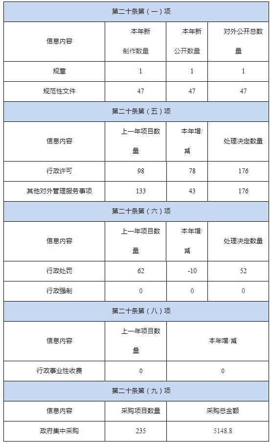本年度報告根據(jù)《中華人民共和國政府信息公開條例》(國務院令第711號)(以下簡稱“條例”)編制,由總體情況、主動公開政府信息情況、收到和處理政府信息公開申請情況、政府信息公開行政復議和行政訴訟情況、存在的主要問題及改進情況、其他需要報告的事項六個部分組成。